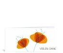 Diese Dankeskarte besticht mit ihrem Design und ihrer Farbgebung. Die beiden Mohnblumen in den Farben Orange und Türkis harmonieren perfekt mit dem beigen Hintergrund, und der dezente Schriftzug "Vielen Dank" rundet die elegante Gestaltung der Vorderseite der Klappkarte ab. Ihr geschäftliches Logo kann auf der Rückseite der Karte platziert werden.