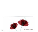 Diese Dankeskarte besticht mit ihrem Design und ihrer Farbgebung. Die beiden Mohnblumen in den Farben Rot und Türkis harmonieren perfekt mit dem weißen Hintergrund, und der dezente Schriftzug "Vielen Dank" rundet die elegante Gestaltung der Vorderseite der Klappkarte ab. Ihr geschäftliches Logo kann auf der Rückseite der Karte platziert werden.