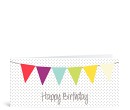 Farbenfrohe Geburtstagswünsche: Über dieser Geburtstagskarte hängen bunte Geburtstags-Wimpel auf Confetti Hintergrund verteilt.