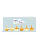 Das „Happy Birthday!“ - des bunten englischen Schriftzugs auf der Vorderseite dieser Geburtstagskarte hätte es eigentlich gar nicht bedurft, denn bereits bei den sechs kleinen roten Törtchen muss jeder sofort an den Geburtstag denken. Der Grundton der Vorderseite der Klappkarte ist hellblau und bildet nicht nur für die leckeren Törtchen in Orange und Gelb, sondern auch für Ihr Logo einen perfekten neutralen Hintergrund.