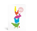 In dieser modernen Osterkarte ist Musik drin: Als Bremer-Oster-Musikanten verkleidet stehen Hühner und Hasen in bunten, frischen Farben auf diesem Motiv locker übereinandergestapelt. In einem pastellfarbenen Kreis, der von den Musikanten leicht verdeckt wird, findet der geneigte Betrachter den Ostergruß "FROHE OSTERN". Mit einem gehörigen Augenzwinkern zaubert dieser Ostergruß als Überraschungshighlight wohl jedem Adressaten ein fröhliches Lächeln ins Gesicht.