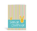 Diese ansprechende Osterkarte zeigt auf frühlingshaft bunten Vertikalstreifen zwei lustige gezeichnete Osterhasen, die rund um den Ostergruß "Sonnige Ostertage" verteilt sind. Eine besonders fröhliche Osterkarte über die sich mit Sicherheit auch Ihre geschäftlichen Kontakte wie Kunden, Lieferanten, Partner oder Mitarbeiter sehr freuen werden!